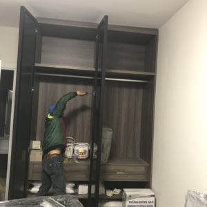 định vị tim lỗ và khoan vít bắt bản lề bật cho cánh kính tủ áo