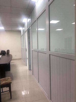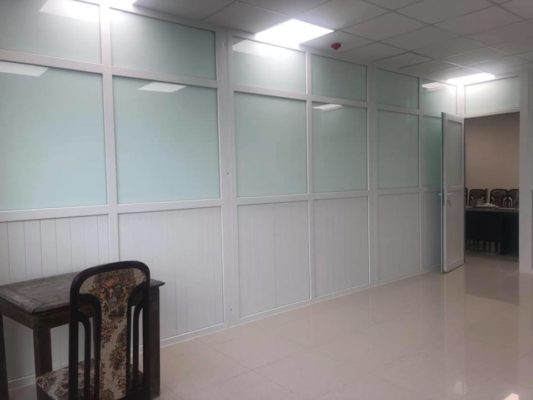 Sản phẩm : vách ngăn nhựa lõi thép gia cường, kính dán an toàn 2 lớp mầu trắng sữa 6.38mm